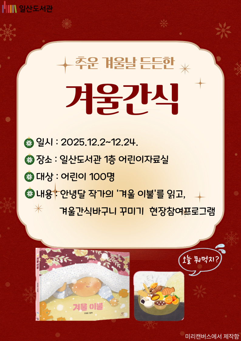 내용: 안녕달 작가의 '겨울이불'책을 읽고, 겨울간식바구니 꾸미기 독후활동