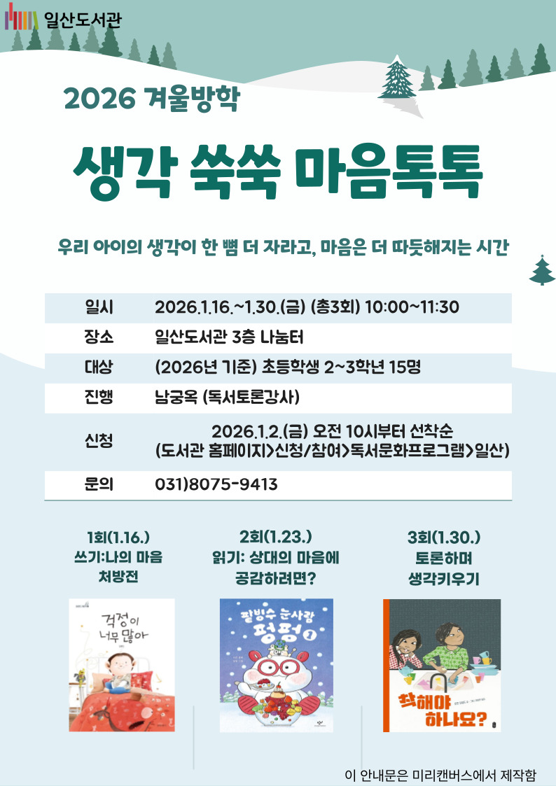 신청: 2026.1.2.(금) 오전10시부터 도서관홈페이지>신청/참여>독서문화프로그램>일산