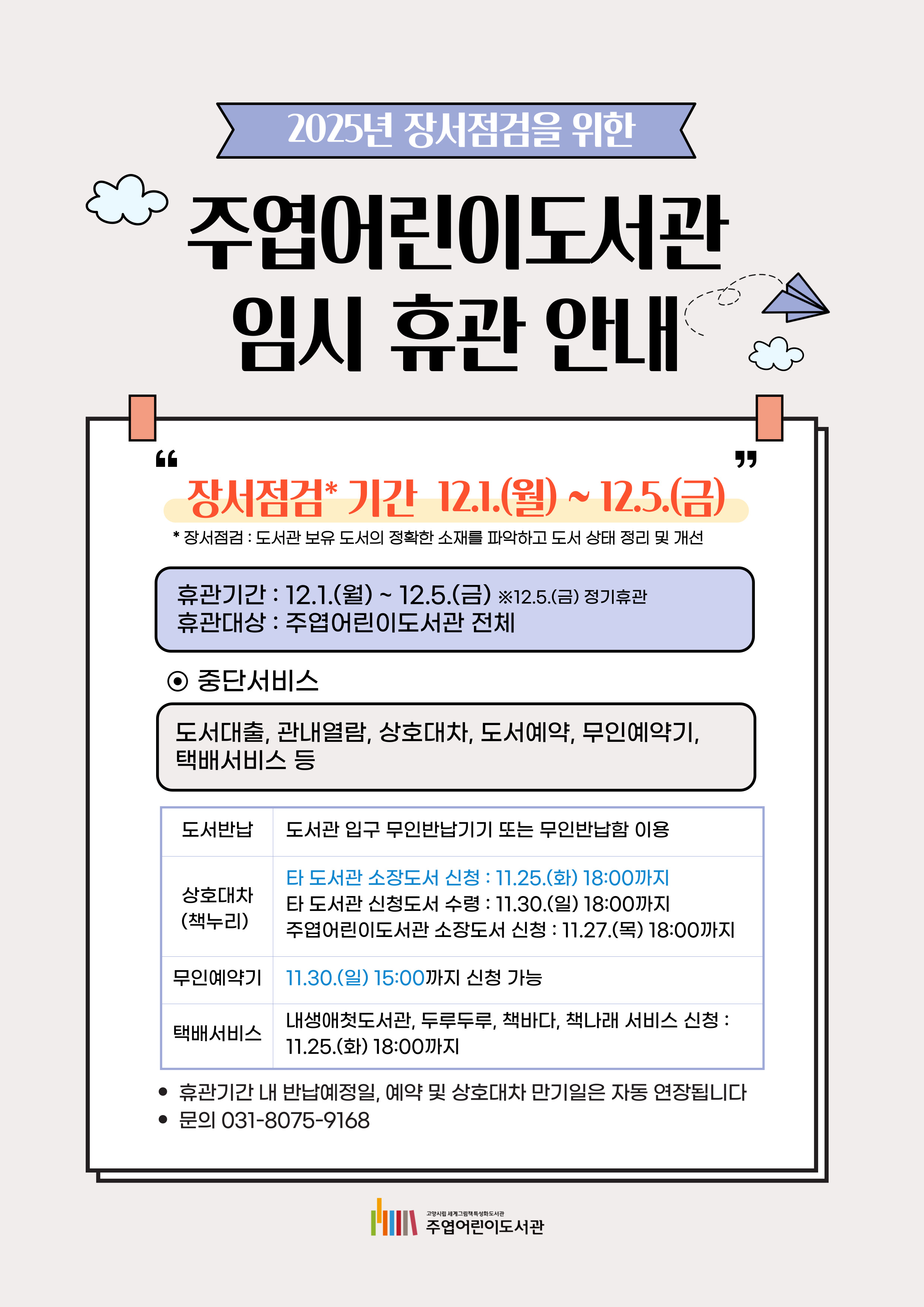 1. 휴관기간 : 2025. 12. 1.(월) ~ 12. 5.(금) / 12. 5.(금) 정기휴관